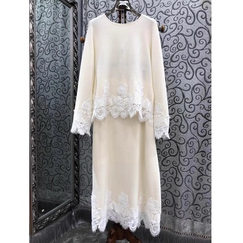 طقم تنورة جديد عالي الجودة لموسم خريف وشتاء 2025 مكون من قطعتين للنساء، سترة صوفية محبوكة من الدانتيل وتنورة طويلة محبوكة