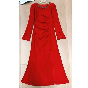 فستان سهرة طويل مقاسات كبيرة 4XL 3XL 2XL لخريف وشتاء 2025، فستان نسائي أحمر وأسود بأكمام طويلة وتطريز يدوي بالخرز وتصميم مرقع بثنيات للمهرجانات