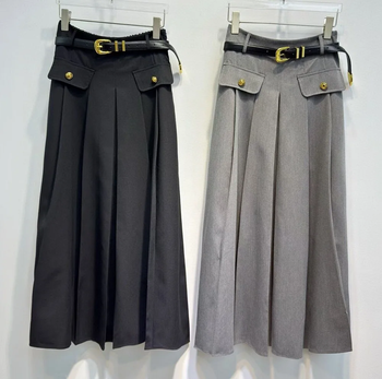 أحدث موضة التنورات الطويلة نمط الخريف والشتاء للنساء حزام زر ديكو أنيق حفلة طويلة أسود رمادي تنورة ملابس طويلة