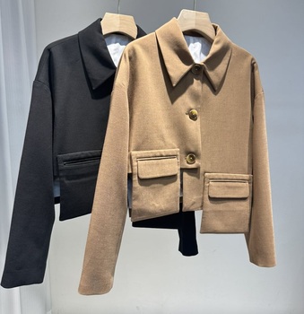 قمم معاطف جديدة الموضة الخريف الشتاء أبلى النساء ياقة بدوره أسفل غير متناظرة جيب خليط عارضة الكاكي معطف أسود