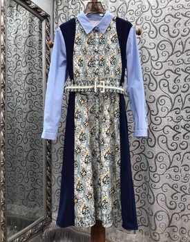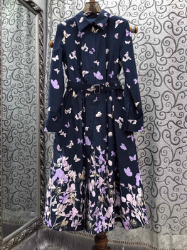 أعلى جودة جديد قميص طويل فستان الخريف للنساء ياقة مطوية لأسفل خمر طباعة الأزهار خليط فستان طويل الأكمام مع حزام