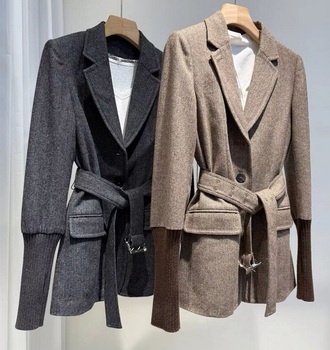 معطف بليزر جديد عالي الجودة لخريف وشتاء 2025، ملابس خارجية نسائية بياقة مسننة، محبوك مع تطعيمات، أكمام طويلة، لون رمادي وكاكي، معطف صوف