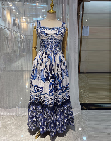 فستان ربيعي جديد عالي الجودة لعام 2026، تصميم أنيق للنساء بحمالات رفيعة، طباعة زهور زرقاء وأوراق خضراء، فستان حفلات بطول منتصف الساق