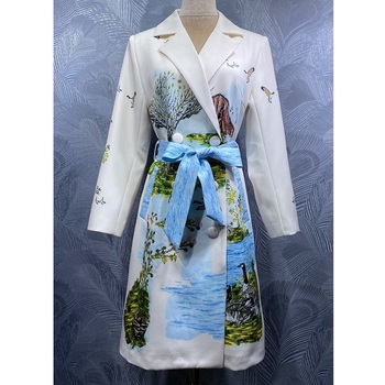 فستان ربيعي جديد عالي الجودة لعام 2026، تصميم أنيق للنساء بياقة مقلوبة وطباعة زهور ملونة، أكمام طويلة، طول منتصف الساق، باللونين الأبيض والأزرق
