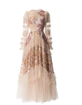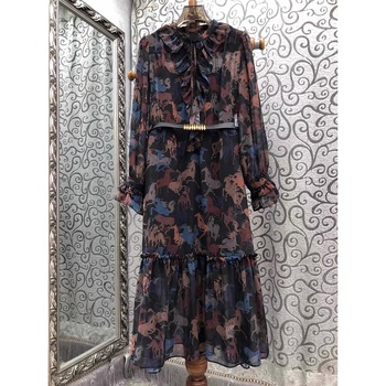 أحدث طقم نسائي خريفي مكشكش زهري ديكو مثير بطبعات حيوانات برية طويلة الأكمام بطول منتصف الساق فستان حفلات على المدرج