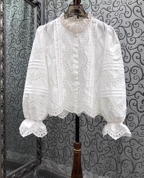بلوزات كتان جديدة على الموضة-بلوزات كتان بيضاء وردية للربيع والصيف للنساء مجوفة مطرزة بأكمام طويلة مثيرة بلوزات فضفاضة XL